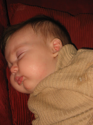 The thing about these conversations is that we have them regardless of where the baby happens to be. So if we're in the kitchen and she's upstairs napping, I still have to ask her where the train is. Last week my parents took Magic Boy to their house for a few hours and my mother said he made her narrate the day to the baby- even though Happy Girl was at home with me. Also, if he tells me to ask the baby something and I don't he can't get past it. He'll wait, repeating, "Momma, ask her about it!" louder and louder until I finally ask the four-month old whatever it is he wants me to ask her. (Trust me, it's easier just to ask her right away.) I'm not really sure why he wants me to ask and tell her things, but it seems he really believes she's communicating somehow. This week, for example, I was sitting in the kitchen finishing my lunch. Happy Girl was relaxing in her swing a few feet away, and Magic Boy asked me if he could watch a movie. I whipped out the tried-and-true "We'll see" (I really don't like to let him watch t.v. but he's been sick so I've made exceptions). He went over to the swing, leaned in and whispered "Baby, can I watch a movie?" A few seconds later, he came running up to me, crying "She said no!!" Ummm... apparently the four-month old caves less easily to the boy's demands than I do. Who knew she could be such a strict disciplinarian?
